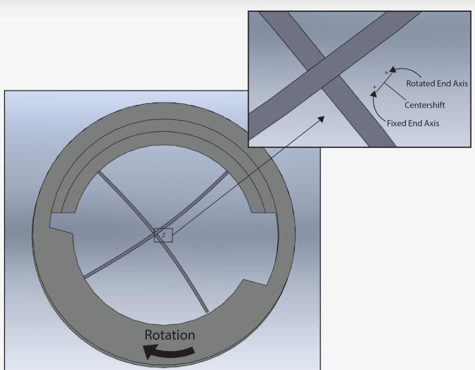 有許多主題和細微差別與C-FLEX產(chǎn)品線相關(guān)。一個常見的話題是“中心轉(zhuǎn)移”現(xiàn)象。中心偏移是樞軸的運動學(xué)屬性,表示軸彼此偏離中心的運動。樞軸的主體本質(zhì)上是一個分成兩半的圓柱體,兩半通過彎曲交叉板簧而相對于彼此旋轉(zhuǎn)。軸的移動(稱為中心移動)是樞軸兩半之間旋轉(zhuǎn)的結(jié)果,如下圖和詳細信息所示。中心偏移的大小是樞軸直徑和操作角度的函數(shù)。在相同角度下,較大直徑的樞軸比較小的樞軸偏離中心更遠。對于大多數(shù)應(yīng)用,**中心偏移小于 0.0005 英寸。此外,中心移位的高度可重復(fù)性允許在某些設(shè)備上校準位移。C-FLEX工程數(shù)據(jù)第 10 頁詳細介紹了中心移位的簡單近似值。使用該圖表,通過將樞軸直徑乘以與偏轉(zhuǎn)角度相對應(yīng)的系數(shù)來進行計算。包括理論計算在內(nèi)的更多具體信息請參閱白皮書“彎曲樞軸應(yīng)用中的注意事項”。