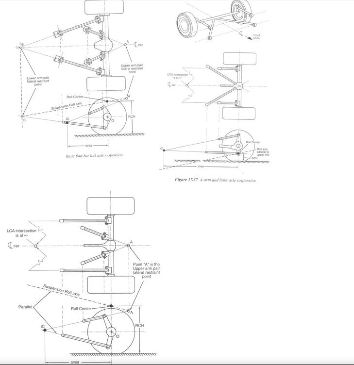 假設(shè)在一輛汽車中,你有一個(gè)經(jīng)典的雙轉(zhuǎn)臂后懸架,它將一個(gè)堅(jiān)實(shí)的后軸固定在所述手臂和這些轉(zhuǎn)臂之間,并在左和右兩個(gè)轉(zhuǎn)軸點(diǎn)上。從幾何角度看,當(dāng)汽車處于行駛高度時(shí),系統(tǒng)的滾轉(zhuǎn)中心是如何發(fā)現(xiàn)的?